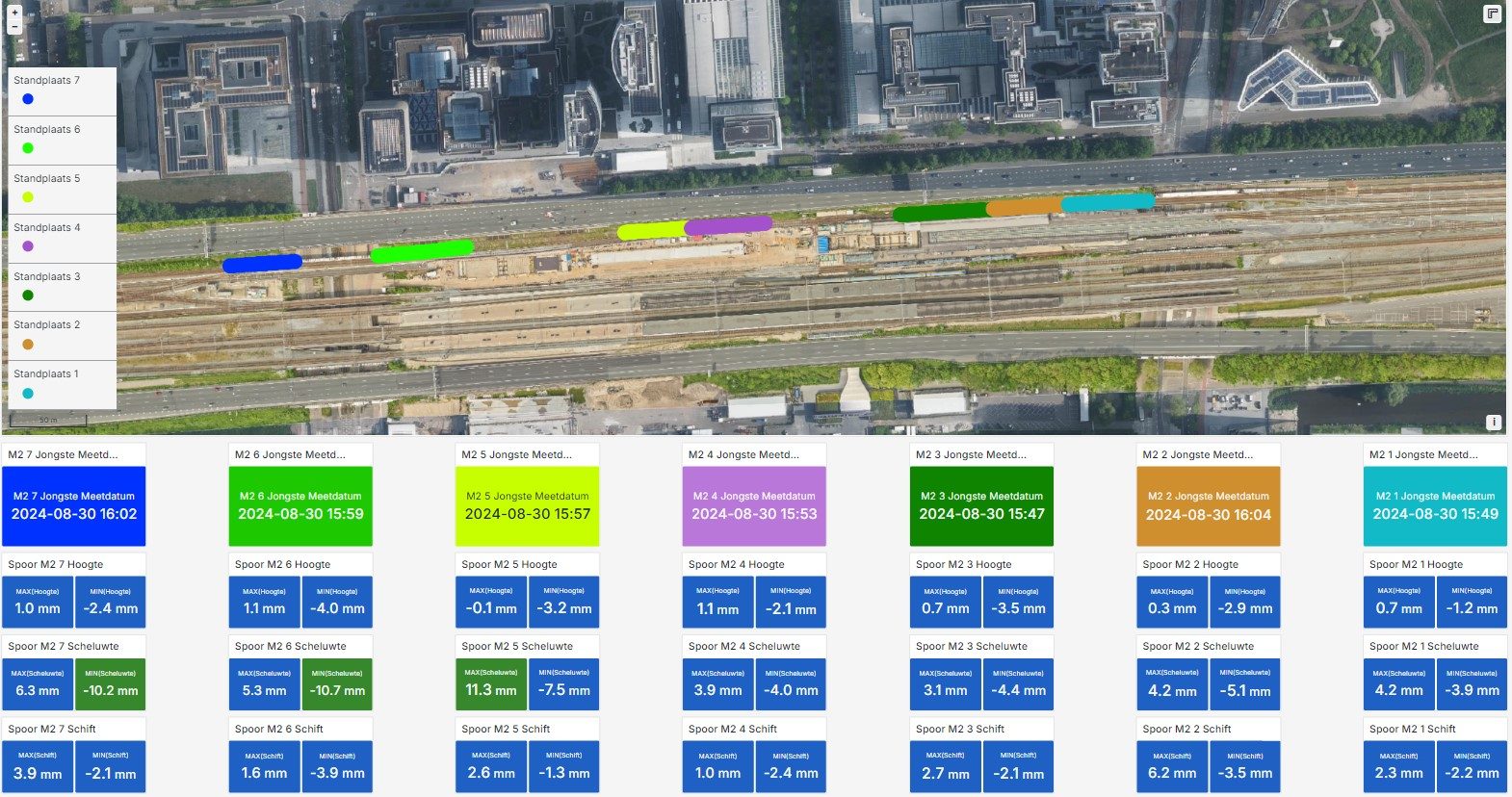GeoNext heeft voor dit project de innovatieve CoffeeCup-live oplossing ingezet. Deze technologie genereert rapportages over de veilige berijdbaarheid van alle sporen, waardoor de opdrachtgever voortdurend inzicht heeft op de stabiliteit van alle sporen en objecten. Via overzichtelijke grafieken (volgens IHS0001/RLN00416 en Metro-normen) wordt direct duidelijk hoeveel tolerantie er nog is en of er actie nodig is. Wanneer er afwijkingen worden geconstateerd, worden de betrokken partijen onmiddellijk via een SMS-alert geïnformeerd, zodat ze direct kunnen reageren.